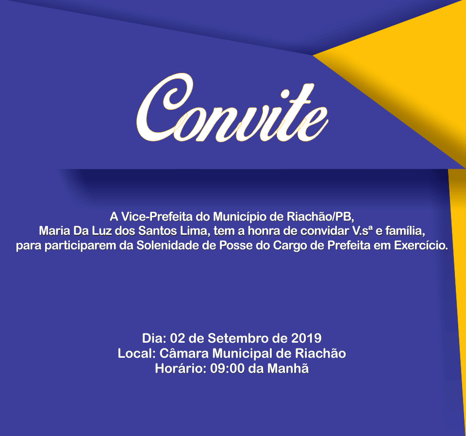 A Vice-prefeita Maria da Luz do Santos convida a todos para solenidade de posse como prefeita em exercício.A solenidade ocorrerá dia 02 de setembro às 9h:00, na Câmara Municipal do Riachão/PB.