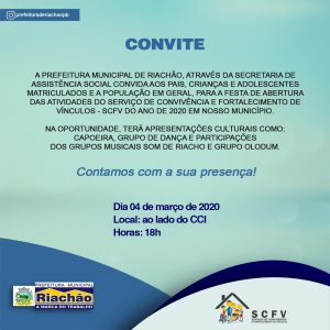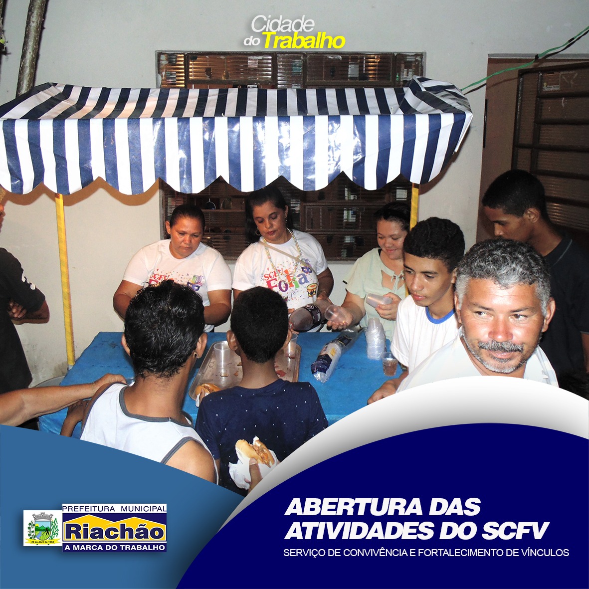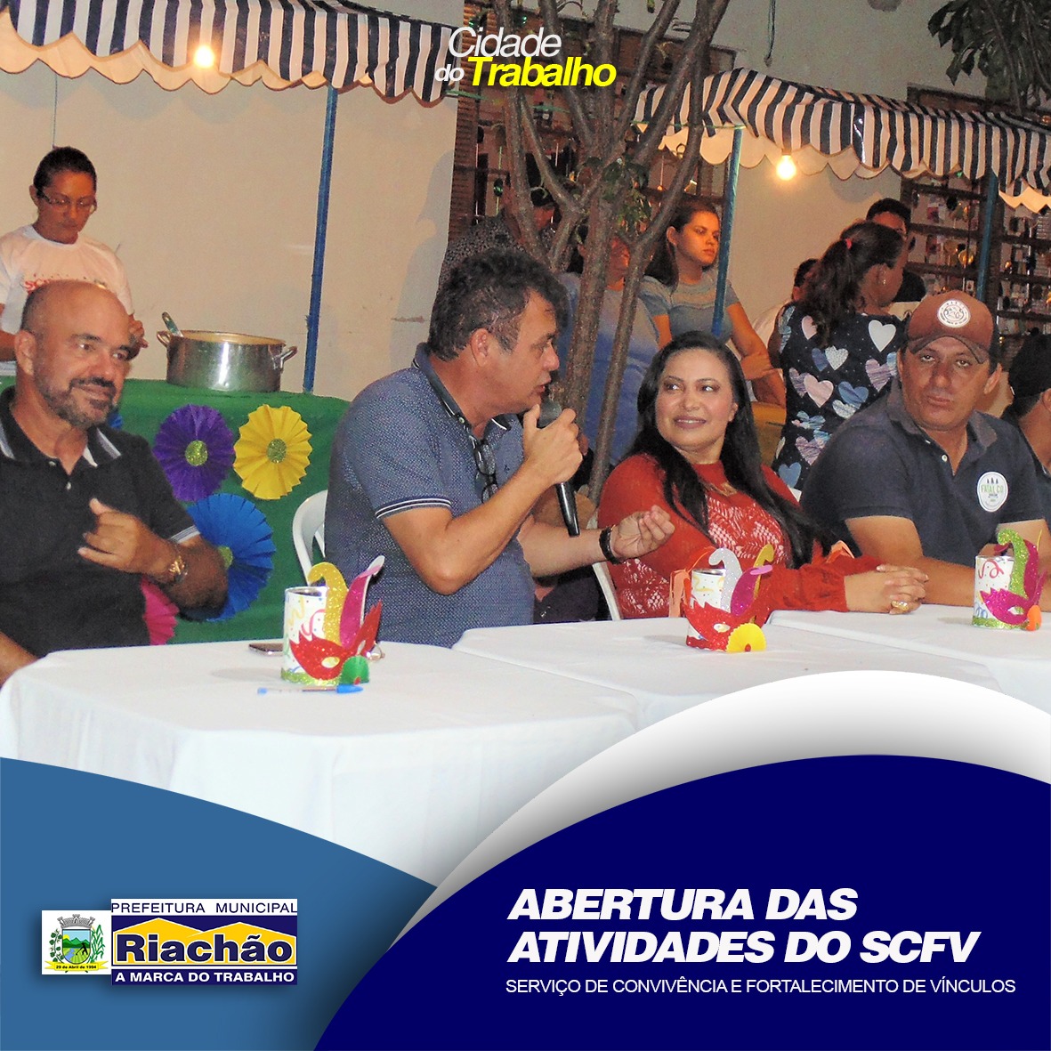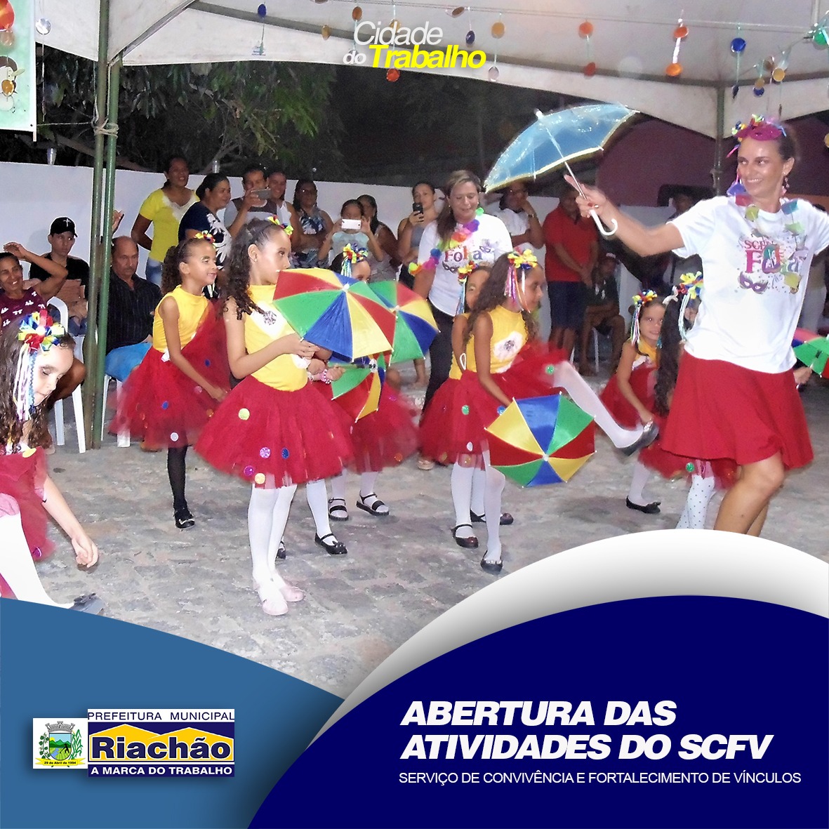 Com muita alegria e diversão, a prefeitura de Riachão deu início às atividades do Serviço de Convivência e Fortalecimento de Vínculos - SCFV 2020 na noite desta quarta-feira 04.O programa tem o objetivo prevenir as situações de risco social, ampliar trocas culturais e de vivências, desenvolver o sentimento de pertença e de identidade, fortalecer vínculos e incentivar a socialização e a convivência comunitária.A vice prefeita Maria Da Luz, como sempre, esta presente nas ações da prefeitura, acompanhando de perto todo trabalho da gestão municipal."O nosso trabalho é constante, sempre em busca de melhorias para o nosso povo de Riachão." Afirma Maria Da Luz.[video width="854" height="480" mp4="https://www.riachao.pb.gov.br/wp-content/uploads/2020/03/Vídeo-Abertura-Atividades-SCFV-2020.mp4"][/video]