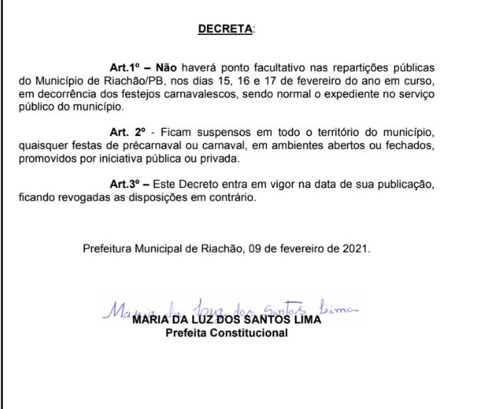 A excelentíssima Prefeita Maria Da Luz dos Santos Lima, em seu exercício, estar sempre consonância com os decretos do Estado da Paraíba, no que se refere aos editais de exercícios de trabalho nas repartições públicas e as medidas sanitárias decretadas pelo Excelentíssimo governador do Estado da Paraíba João Azevedo.Para tanto, em consonância com o decreto publicado de número 40.652 pelo governador da Paraíba, a Prefeita Maria Da Luz dos Santos Lima, considera tal decreto em resoluto, decreta que NÃO HAVERÁ PONTO FACULTATIVO nós dias 15, 16 e 17 de Fervereiro.