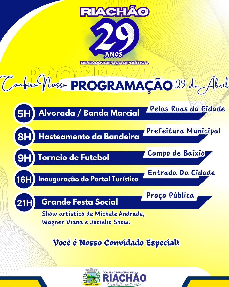 (cinco horas da manhã): Alvorada pelas ruas da cidade;8h (oito horas da manhã): Hasteamento da Bandeira;9h (nove horas da manhã): Torneio de Futebol;16h (Quatro horas da tarde): Inauguração do portal Turístico;21h (nove horas da noite): Show em praça pública.