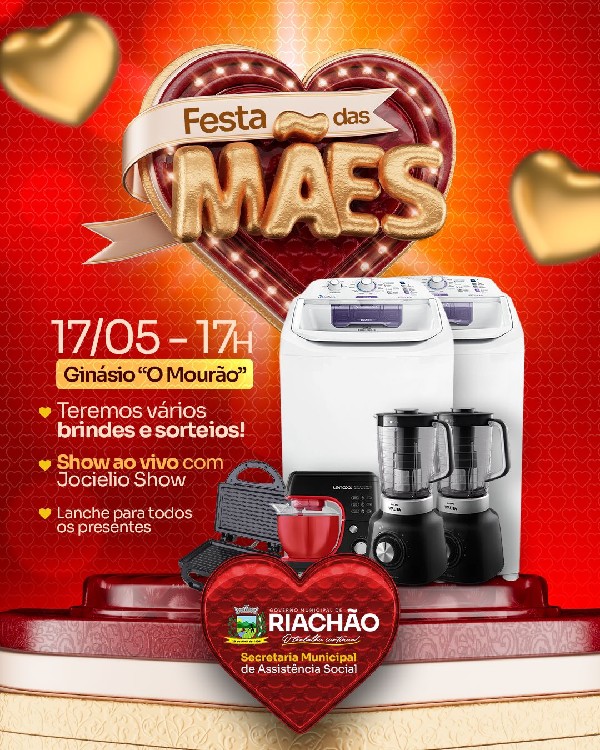 O Governo Municipal, em conjunto com a Secretaria Municipal de Assistência Social, está preparando uma pogramação toda especial em alusão ao Dia das Mães para celebrar junto com todas as mamães riachãoenses. Marcada para acontecer nesta sexta-feira, dia 17 de maio, o local escolhido para sediar o evento será o Ginásio de Esportes "o Mourão", a partir das 17H. A festividade contará com homenagens, sorteio de vários brindes, lanches para todos os presentes, além de música ao vivo para abrilhantar ainda mais o momento.