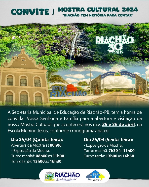 O Governo Municipal realizará, através da Secretaria Municipal de Educação, a Mostra Cultural 2024 que terá como temática "Riachão tem história para contar", em comemoração aos 30 anos de emancipação da cidade. Esta, por sua vez, acontecerá entre os dias 25 e 26 de abril do corrente ano na Escola Municipal de Ensino Fundamental Menino Jesus, nos horários acima mencionados. Venha participar e prestigiar conosco nossos alunos, educadores e demais colaboradores.