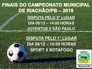 CONVITE!A Comissão Organizadora do Campeonato juntamente com a Prefeitura Municipal de Riachão (Prefeito Fábio Moura de Moura) convida todos os munícipes, desportistas da região para assistir os jogos das Finais do Campeonato Municipal de Futebol, que será realizado no dia 09 de dezembro de 2018, a partir das 14:00 no Estádio Municipal de Futebol "O Meninão" com os seguintes