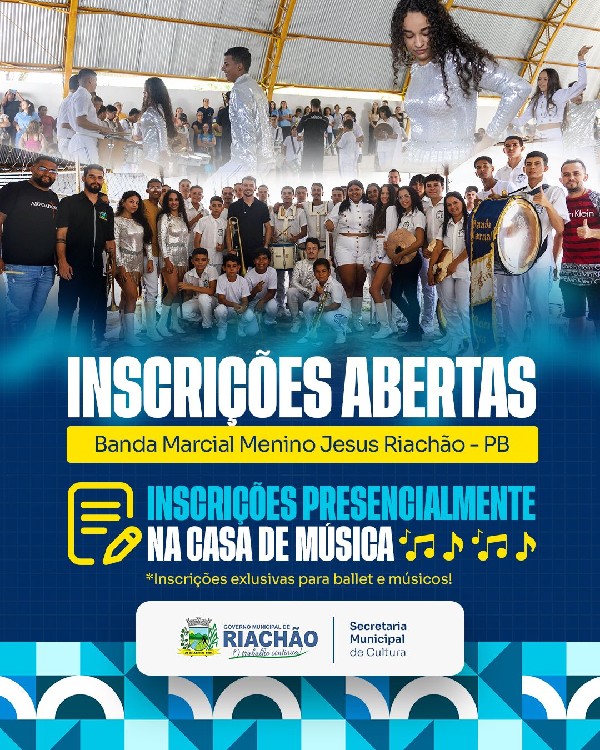 A Secretaria Municipal de Cultura, Esporte e Lazer Comunica que estão abertas as inscrições para a Banda Marcial Menino Jesus. As inscrições estãos sendo realizadas presencialmente na Casa de Música da cidade e foram disponibilizadas vagas para o Ballet e também para a Equipe de Músicos.