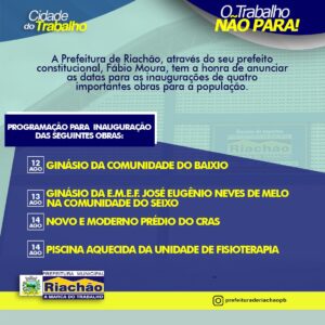 O prefeito Fábio Moura tem a honra de anunciar a programação oficial para as inaugurações de quatro importantes obras para o nosso município agora no mês de agosto.São dois ginásios, sendo um na comunidade do Baixio e outro na comunidade do Seixo onde vai beneficiar de forma direta os nossos atletas daqueles setores. Será inaugurado também o mais novo e moderno prédio do Centro de Referência de Assistência Social - CRAS com mais conforto e muitas novidades para todas as pessoas que são atendidas por este serviço, além da inauguração da piscina aquecida da unidade de fisioterapia do nosso município.É com muito trabalho, respeito com o dinheiro do povo e muita dedicação, que a nossa cidade avança.O trabalho não pode parar!PREFEITURA DE RIACHÃO.CIDADE DO TRABALHO.