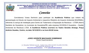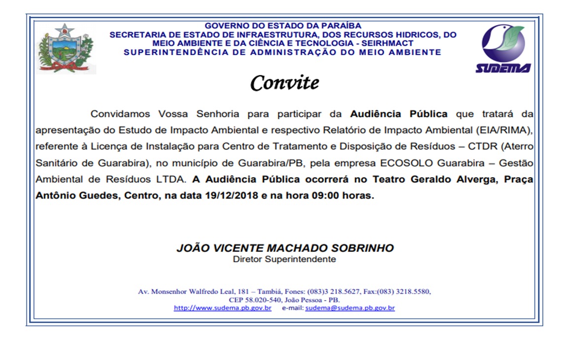 A Superintendência de Administração do Meio Ambiente (SUDEMA) do Estado da Paraíba, realizará no próximo dia 19 de dezembro, às 09h, no Teatro Geraldo Alverga Cabral, no Centro de Guarabira, uma Audiência Pública para apresentação do Estudo de Impacto Ambiental e respectivo relatório de impacto (EIA/RIMA), referente à Licença de Instalação para Centro de Treinamento e Disposição de Resíduos (CTDR) Aterro Sanitário da Região de Guarabira. O documento deve ser concedido a empresa executante do serviço, ECOSOLO Guarabira Gestão Ambiental de Resíduos LTDA.A Audiência deve contar com a participação dos prefeitos da região integrante do Consórcio Intermunicipal de Resíduos Sólidos CONSIRES, representantes da empresa executante do serviço de aterro, representante de entidades e sindicatos ligados à área de coleta seletiva, além de toda a sociedade que queira se fazer presente.